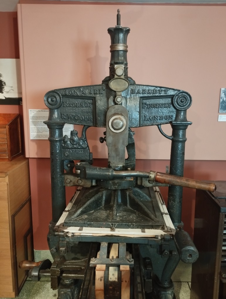 Scendendo al piano inferiore, una piccola sala racconta uno degli ultimi capitoli della storia professionale di Morris. La casa in cui ci troviamo, infatti, fu anche la sede della Kelmscott Press, una casa editrice che l’artista volle creare per contribuire a diffondere bellezza anche tramite l’arte della stamperia e tipografia artigianale. Nella sala troviamo un esemplare della stupenda macchina a torchio modello Albion, prima metà dell’Ottocento, lo stesso usato da Morris e colleghi per imprese titaniche come la stampa a caratteri mobili delle opere complete di Chaucer, del poema anglosassone Beowulf, nonché di molte opere di Morris stesso. Tutti i volumi pubblicati in circa dieci anni di attività si distinguevano per una scelta minuziosa della carta, dei caratteri, dell’impaginazione e delle decorazioni, il tutto degno di veri e propri artisti rinascimentali e rigorosamente prodotto a mano.