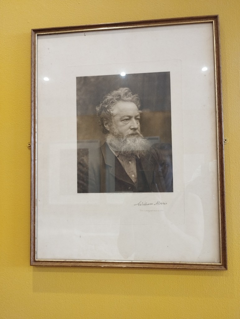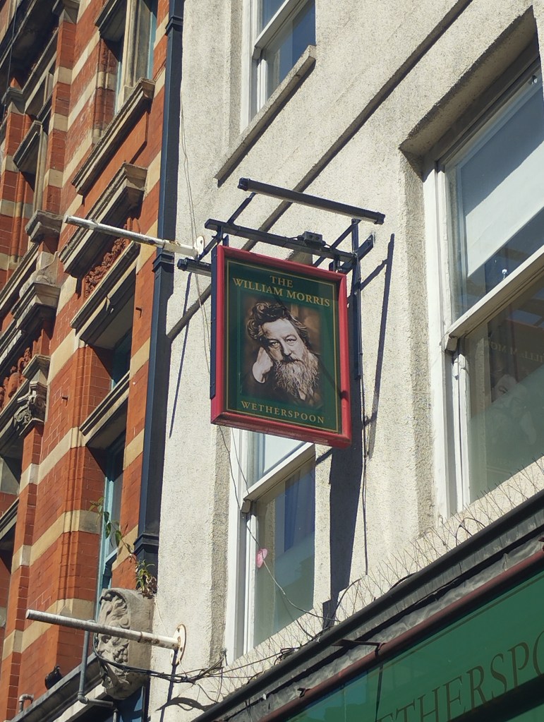 Riuscendo poi su King Street, William ci guarda dall’insegna del pub. Chissà cosa pensava quando gli hanno scattato quella foto. Vedendolo posizionato così oggi, però, non posso fare a meno di immaginare che il suo sguardo intenso sia di sarcastica perplessità, come se volesse interpellare e, diciamolo, un po’ giudicare i passanti diretti a comprare articoli di fast fashion fatti in serie da lavoratori sfruttati a giro per il mondo – la cosa più lontana possibile da quegli ideali di bellezza artigianale e diritti sociali che Morris aveva tentato di diffondere per tutta la sua vita.