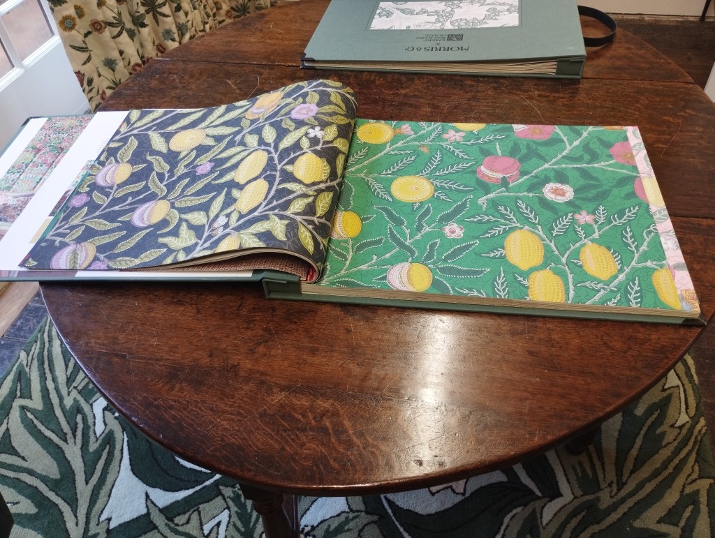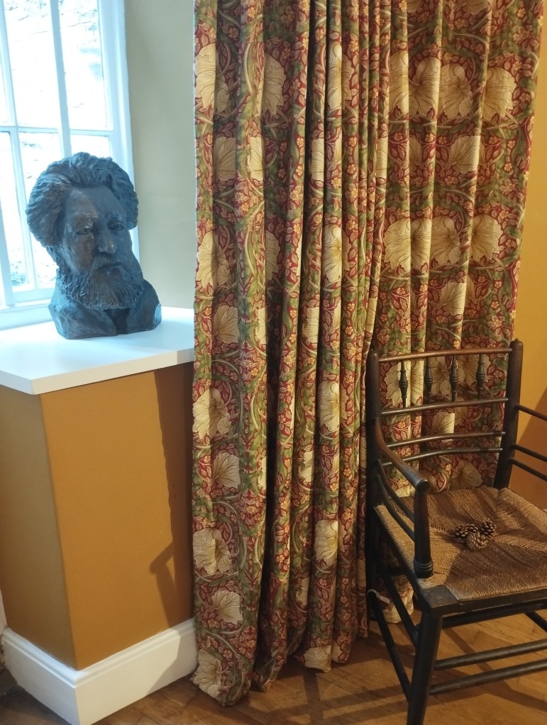 Quello che colpisce subito è l’atmosfera di calore data dalle tonalità delle pareti, che mettono in risalto le stampe esposte, molte delle quali sono i motivi floreali o astratti che Morris e i suoi collaboratori sviluppavano poi in carta da parati. Ma il senso di accoglienza è dato anche dai materiali degli arredi, che, in perfetto stile inglese, sono tutti di legno e su misura: i pavimenti, i rivestimenti, gli infissi. Osservando poi alcuni dettagli, si nota che le sedie sono proprio quelle progettate dalla Morris & Co., essenziali ma artigianali, e le tende, va da sé, sono fabbricate con i motivi che hanno reso lo stile di Morris famoso in tutto il mondo. In una piccola sala che dà sul retro della casa, si può ammirare uno dei cataloghi della ditta, che è un vero e proprio tripudio per gli occhi.